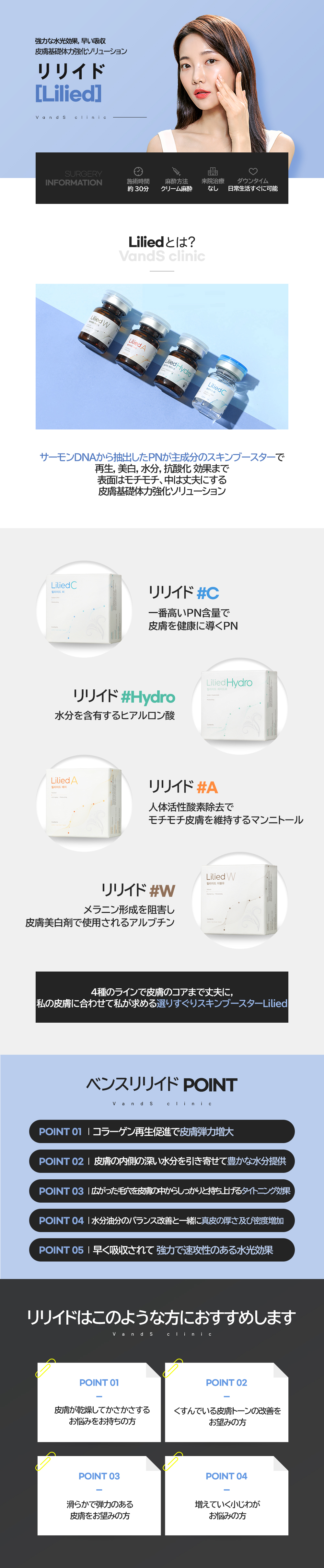 A. 従来のハイジュ水光注射は医薬品ですが、 リリイドMはプレミアムヒアルロン酸ナトリウムを含む医療機器・組織修復用生体材料です。厳格な精製プロセスを経て作られた製品で、肌に即座に水分をチャージし、肌内部のコラーゲンを再生することができます。特に吸収が早く、施術後すぐに日常生活が可能です。